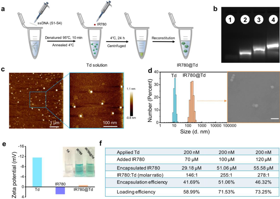 研究者运用DNA四面体框架结构(Td)与IR780通过静电作用和π-π堆积效应,得到IR780 @ Td的纳米聚集体。IR780的水溶性和光稳定性均得以改善,所得200 nm左右的纳米尺寸尤其适合高温介导的EPR效应,以实现肿瘤部位的高效积聚与渗透(图2)。