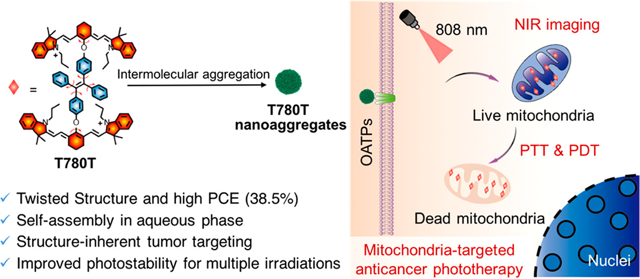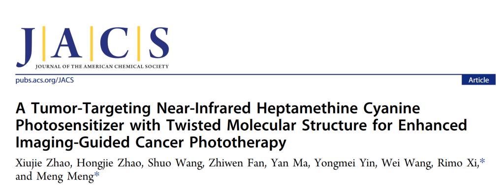 (通讯员 孟萌)近日,伟德国际victor1946郗日沫教授,孟萌副教授课题组在国际著名学术期刊《J. Am. Chem. Soc.》发表题为“A Tumor-Targeting Near-Infrared Heptamethine Cyanine Photosensitizer with Twisted Molecular Structure for Enhanced Imaging-Guided Cancer Phototherapy”的研究论文。研究团队设计合成了一种肿瘤靶向型近红外光敏剂T780T:在两分子花菁光敏剂IR780之间引入四苯基乙烯(TPE)的扭曲结构,以提高其光热转换效率和光热稳定性。所构建分子T780T在水相中可自组装成均匀的纳米聚集体,荷瘤小鼠尾静脉注射给药后,T780T聚集体展现出明显的肿瘤蓄积效果,经一次给药两次激光照射的治疗方式,实现了更显著的肿瘤抑制效果。