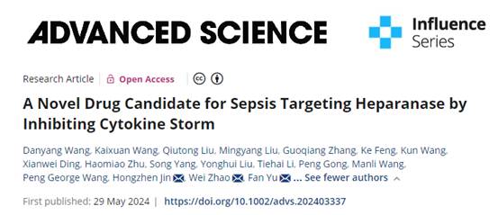 2024年5月30日,伟德国际victor1946赵炜教授团队与康复大学于凡研究员团队合作在Advanced Science在线发表题为“A Novel Drug Candidate for Sepsis Targeting Heparanase by Inhibiting Cytokine Storm”的研究论文。这项突破性研究针对脓毒症这一全球药物研发成功率极低的疾病,以保护血管内皮屏障为出发点,提出了一种全新的治疗策略。基于该策略研究团队开发了寡糖类乙酰肝素酶抑制剂CV122并深入探索了其在治疗脓毒症方面的潜力。CV122发挥其“糖衣护卫”的作用,能够精准地靶向乙酰肝素酶、有效减少血管内皮糖被的降解,从而维护血管屏障的完整性,这一创新性的治疗思路,不仅有助于调节机体的免疫反应,还能有效保护肺部等关键器官免受炎症的侵害。通过一系列严谨的实验验证,CV122在多种动物模型中展现出了强大的治疗潜力,显著提高了脓毒症小鼠的生存率。这不仅证明了CV122作为一种具有明确靶点、卓越药效和治疗作用广谱的候选药物的潜力,更重要的是,基于保护血管屏障的创新思路,为脓毒症治疗的未来指明了新的方向。