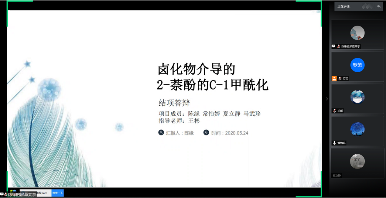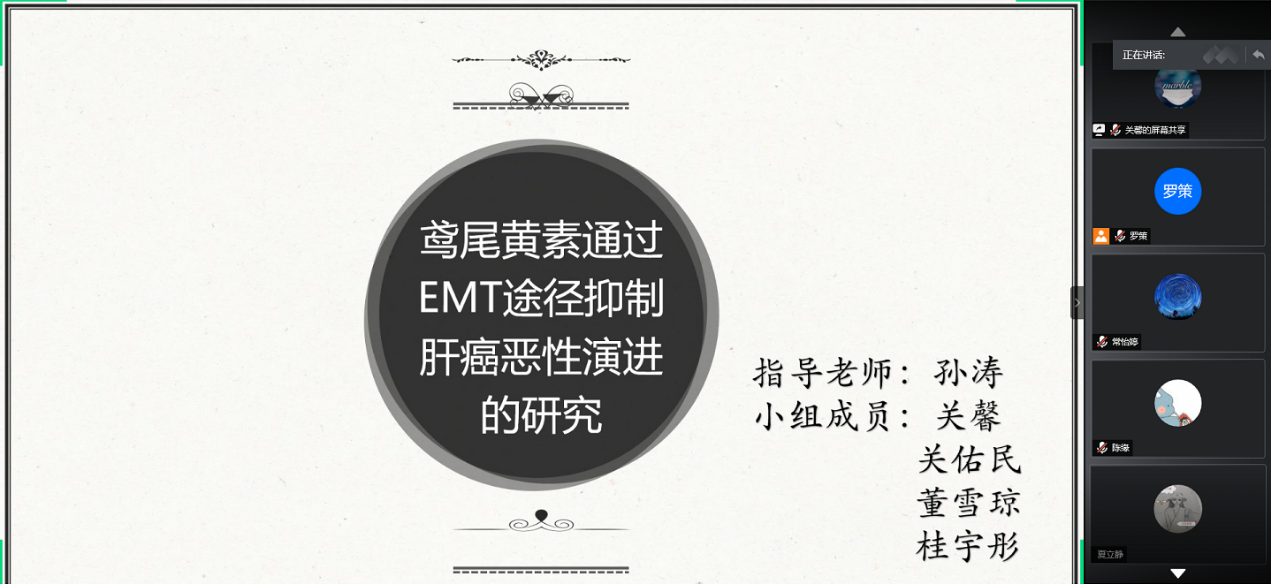 各项目组汇报了立项以来的科研工作经过及完成情况。本次项目汇报涉及药物化学合成、天然药物学、药理学、计算机辅助药物设计等多个方向。其中多个项目借助了计算机工具进行药学相关研究,如小分子对接、筛选潜在药物靶点等,跨专业研究也给了许多项目组更加全面的视角和研究方法。