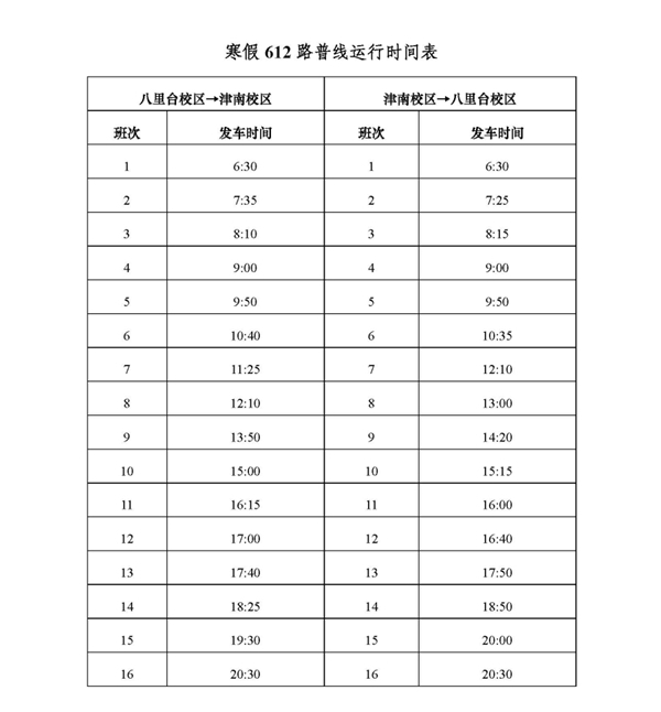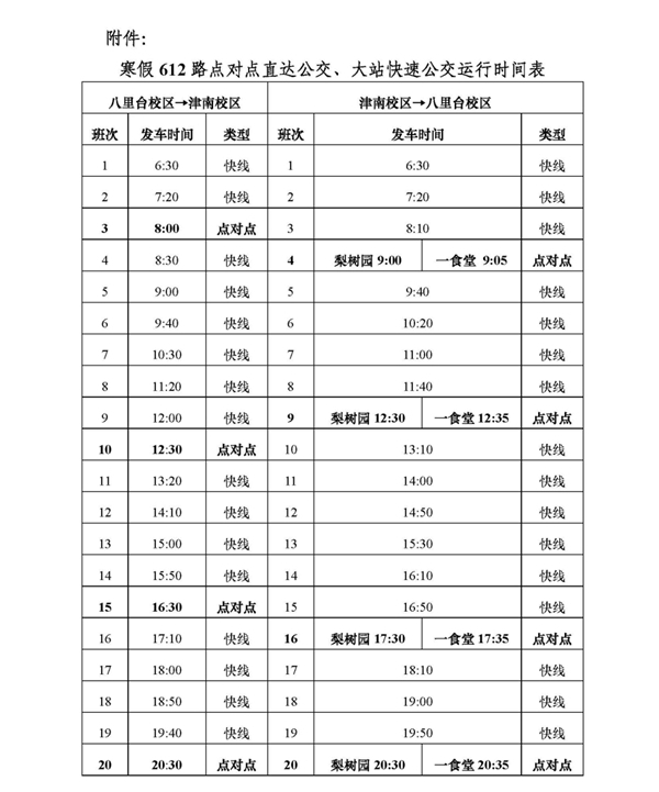 寒假期间,点对点直达公交、大站快速公交、普线公交运行路线及停靠站点不变;津南校区225路校园公交停运。